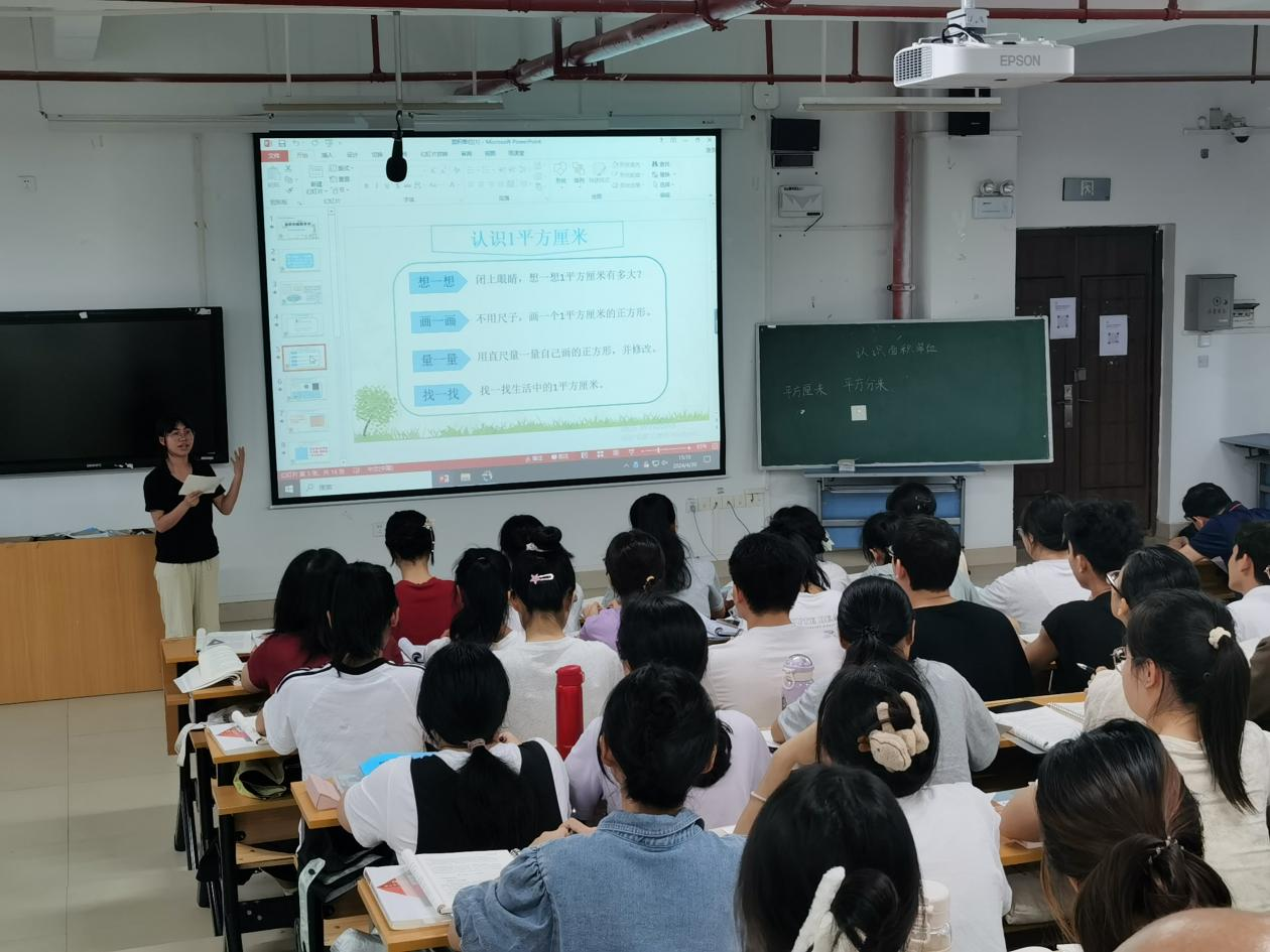 周俊伽老师是学校第三届教师教学创新大赛一等奖获得者,本次活动她讲授小学教育专业“小学数学教学设计”课程“数学核心素养下图形与几何测量单位量感的培养”专题。周老师紧紧围绕小学数学新课标的要求,从学情实际出发,采用线上线下混合式教学、小组合作探究、小组作业展示、教师讲授和点评等多种教学方法开展教学,并在课堂中灵活使用信息化教育技术,课堂气氛活跃,师生、生生互动积极,很好地体现了“学生中心”“成果导向”的教育教学理念,呈现了一堂精彩的探究型、综合性实践技能课。